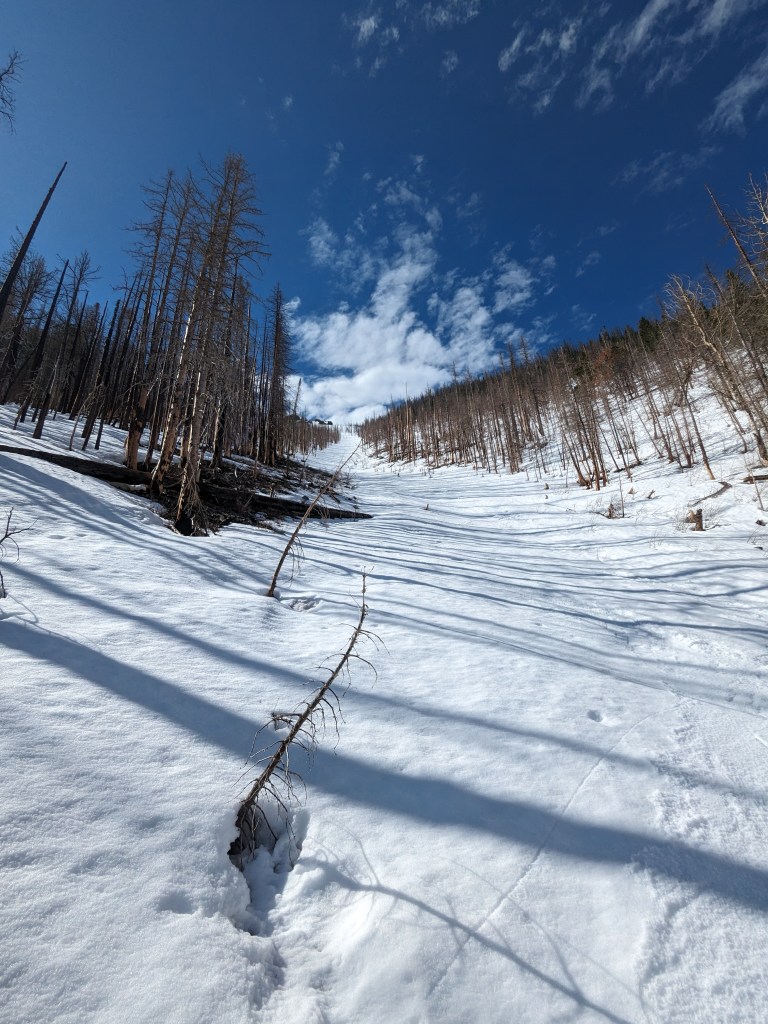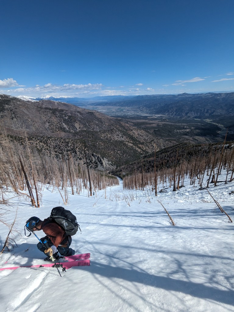 Chaz then experienced every ski tourers fear: he dropped his skis. They didn’t go down more than 150 feet, so it wasn’t the end of the world, but he did miss out on the fun part of the run. I enjoyed that 150 feet and found his skis resting against a tree.