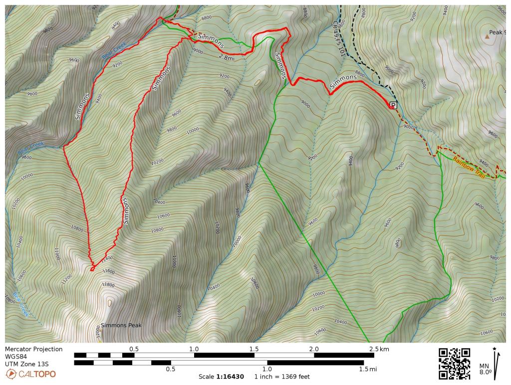 The snow past the trees wasn’t great from what I remember, Simmons definitely saw a recent avalanche from a storm the week or so prior. It got really crusty and had some downed trees poking through, but we persevered and enjoyed what we could. We were rewarded with a lengthy bushwack along a creek and eventually hit the Rainbow Trail.